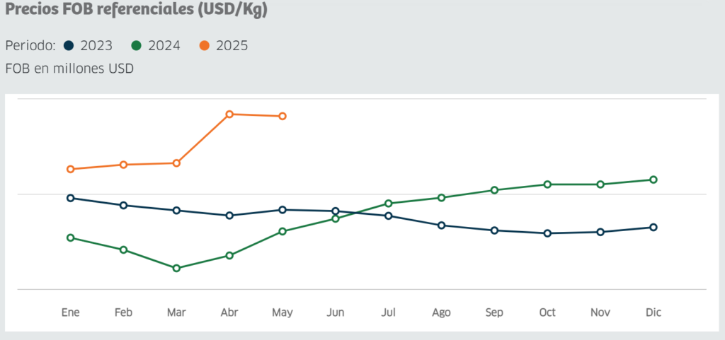 Solo en junio el valor exportado de café llegó a los US$124,7 millones, un incremento de 106,7% frente al mismo mes del 2024, explicado por el aumento de su precio promedio de exportación en 77%.