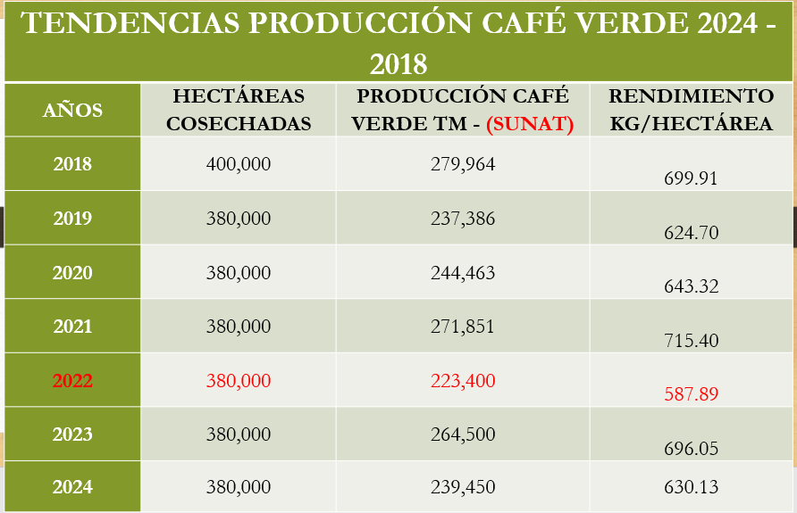 El Perú viene presentando un proceso de contracción en la oferta de café. A pesar de las importantes cifras en términos de exportación para el 2025, en un año pico como el 2011 la producción fue de 7 millones 400.000 quintales, de los cuales se exportaron 6 millones 500.000 quintales, que permitieron exportaciones por US$1.600 millones.