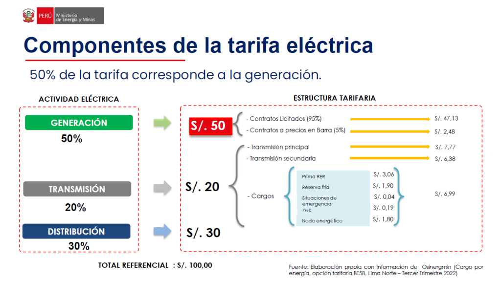 De acuerdo con cifras oficiales del Osinergmin y del COES, que registran y reportan las estadísticas del sector eléctrico, es la generación eléctrica (sea hidráulica, térmica, eólica y/o solar, entre otras) la que representa el 50% en la estructura tarifaria residencial.