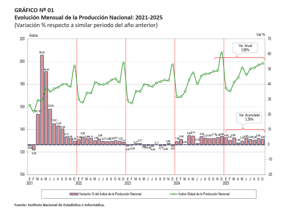 En octubre la actividad económica del país, expresada a través de la medición del Producto Bruto Interno (PBI), creció en 3,62% respecto a similar periodo del 2024, informó el Instituto Nacional de Estadística e Informática (INEI).