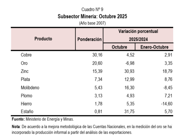 En el ámbito de la minería metálica, que creció 7,18% en octubre, anotó un avance en forma sostenida durante cinco meses, impulsada por los elevados niveles de producción de zinc (30,93%), cobre (4,52%) y molibdeno (16,30%), secundada en menor magnitud por las alzas en la producción de plata (12,99%), hierro (5,35%), estaño (31,75%) y plomo (4,93%); situación atenuada por la contracción en el volumen de producción oro (-6,98%), de acuerdo con datos del INEI.